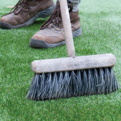 人工芝をマークした区域を完璧に覆うことができるように、木材の外周の端にかかるすべての切り口のエンジを切り取ります。約375pxごとに亜鉛メッキU字ピンを使用して、芝生を 木材フレームに固定します。
