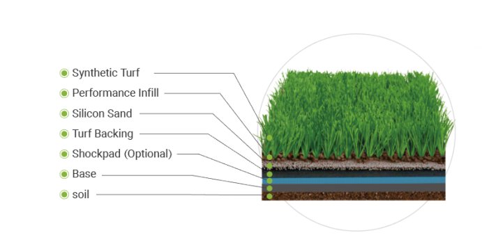 人工芝システムは、さまざまなコンポーネントで構成されています。これらのコンポーネントの正しい組み合わせは、現場での完璧なパフォーマンスを保証します。表面層とサブベースは区別されます。